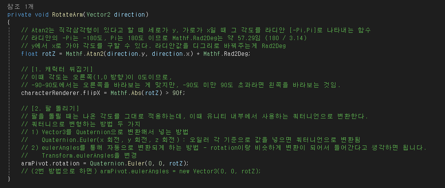 // (2번 방법으로 하면) armPivot.eulerAngles = new Vector3(0, 0, rotZ);