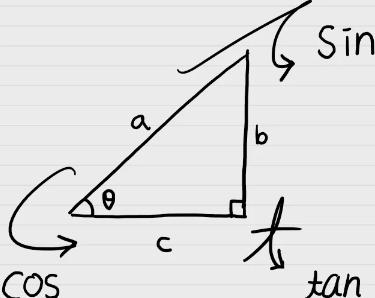sin = 높이/빗변 cos = 밑변/빗변 tan = 높이/밑변