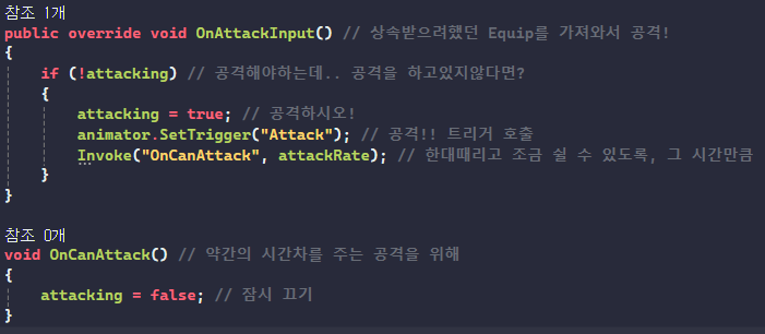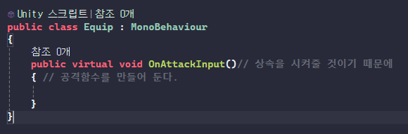 curEquip.OnAttackInput(); //상속된 친구의 함수를 실행해줘서 애니메이션 동작하게끔