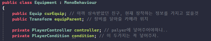 public Equip curEquip; // 아까 상속받았던 친구, 현재 장착하는 정보를 가지고 있을것