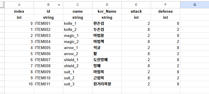 구글 스프레드로 막 데이터 넣어준다.