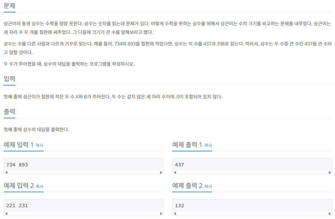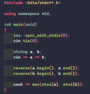 백준 C++ 2908번 상수 ( reverse, stoi ) 본문