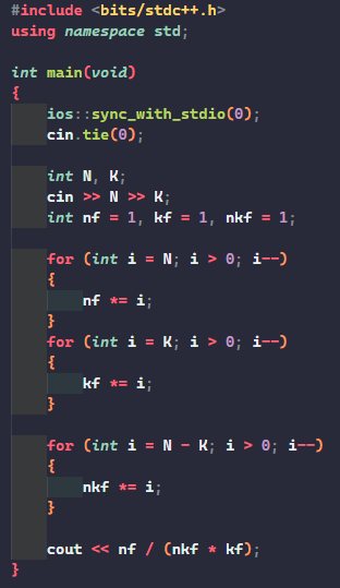 int ans = fact(N) / (fact(K) * fact(N - K));