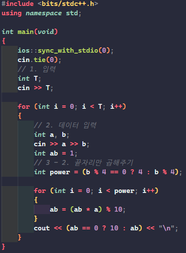 백준 C++ 1009번 분산처리 ( 일의자리 구하는 법 ) 본문
