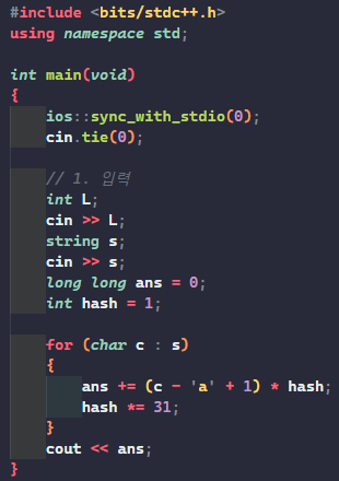 백준 C++ 15829번 Hashing ( mod M, 시그마란? ) 본문